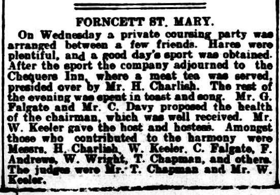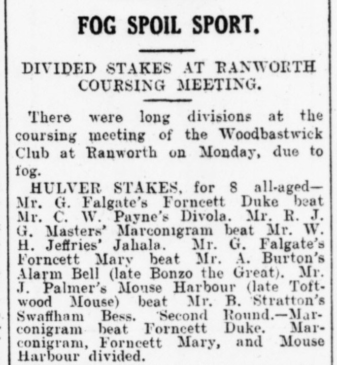 The successful 'Forncett Boy' was owned by George Falgate from Forncett St. Mary who was president of the Forncett club in 1908. In November 1929, George was recorded as entering two of his dogs, Forncett Duke and Forncett Mary, at a coursing event at Ranworth.