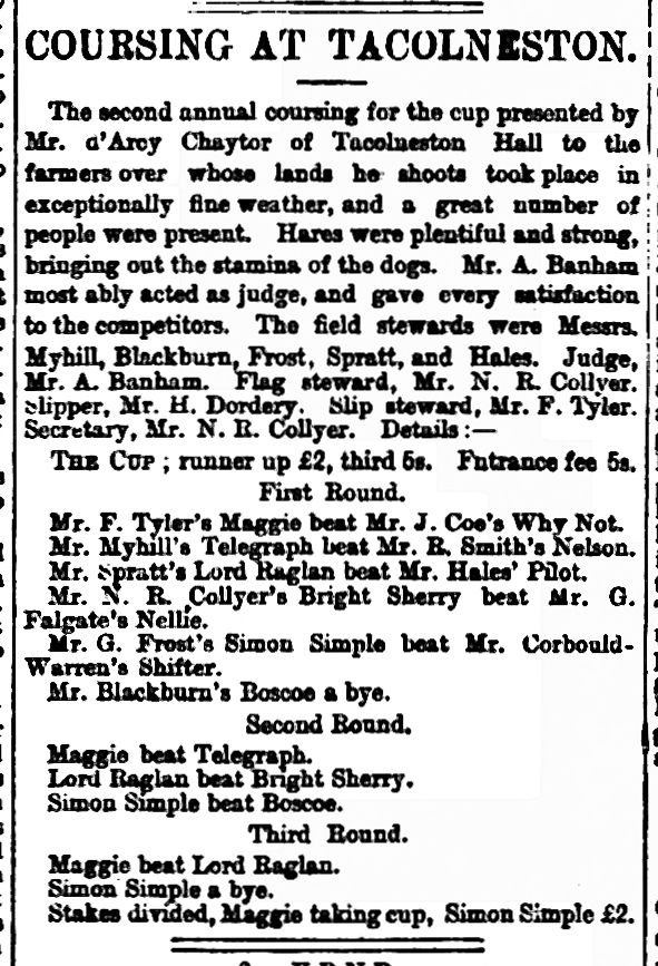 During the late 19th and early 20th centuries formal coursing competitions were held across East Anglia. They appear to have been conducted following rules similar to the ancient Laws of the Leash. One such meeting was held at Tacolneston Hall in 1901.