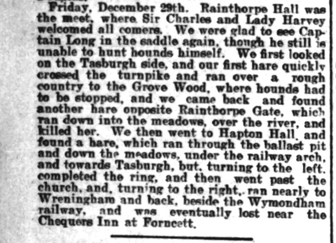 It should be mentioned that hares were also hunted using horses and hounds. Dunston Harriers was founded in 1830 and their meets were reported regularly in the newspapers. One report, in the Norfolk News on 6th January 1906, shows that, gratifyingly, the hare did occasionally escape but it also records the amazing distances that the hare could cover during the chase!