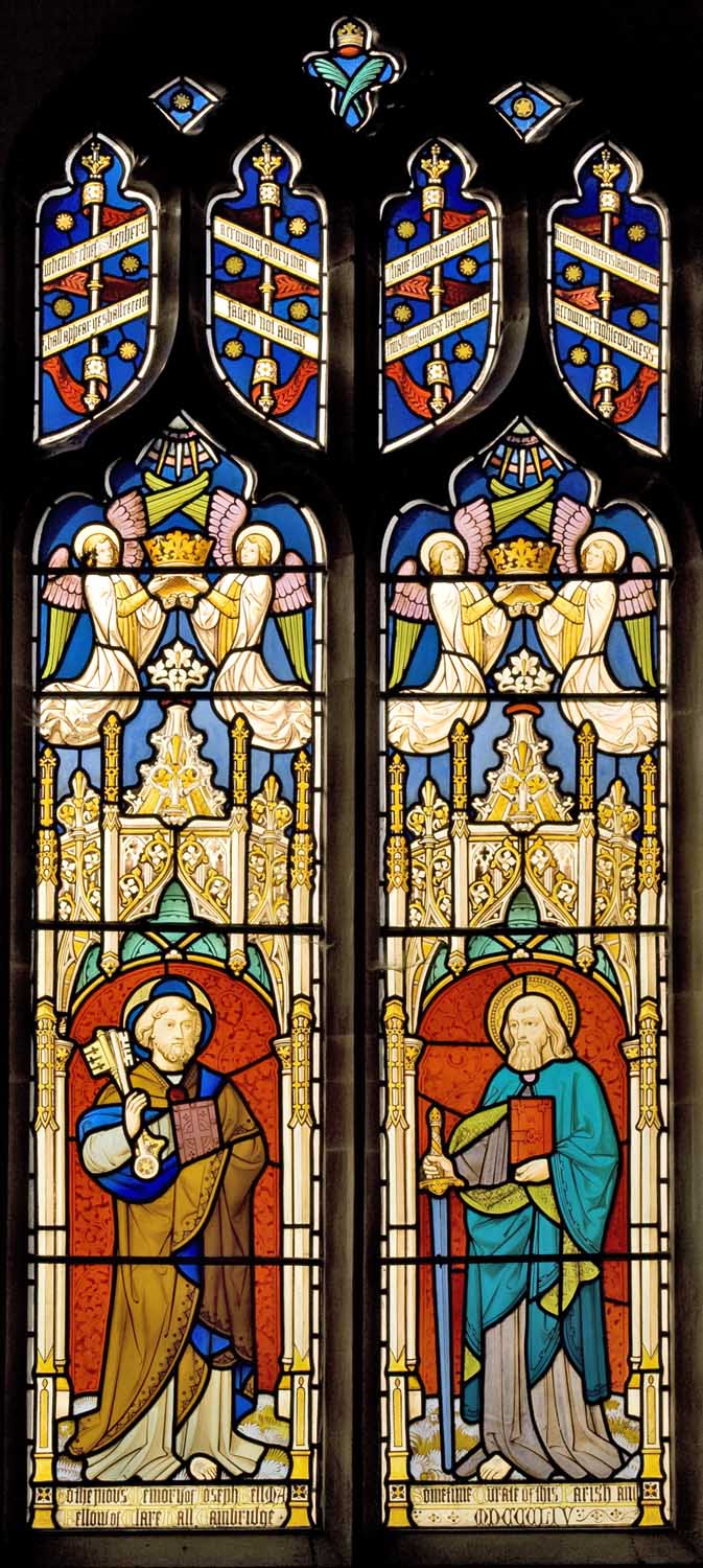 The Joseph Bell memorial window, which depicts St. Peter and St. Paul, was installed in the south chancel in 1854. The window was created by F. W. Oliphant (1818-1859) who had a considerable reputation as a designer of painted glass. His ecclesiastical work can be found in many places including King's College, Cambridge and Ely Cathedral.