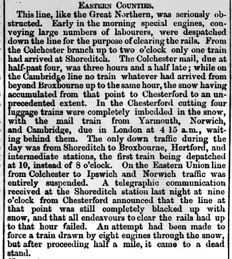 On the 3rd and 4th of January 1854 there were very heavy snowfalls across East Anglia leaving an average snow depth of three feet, so that the railways were brought to a complete standstill.
