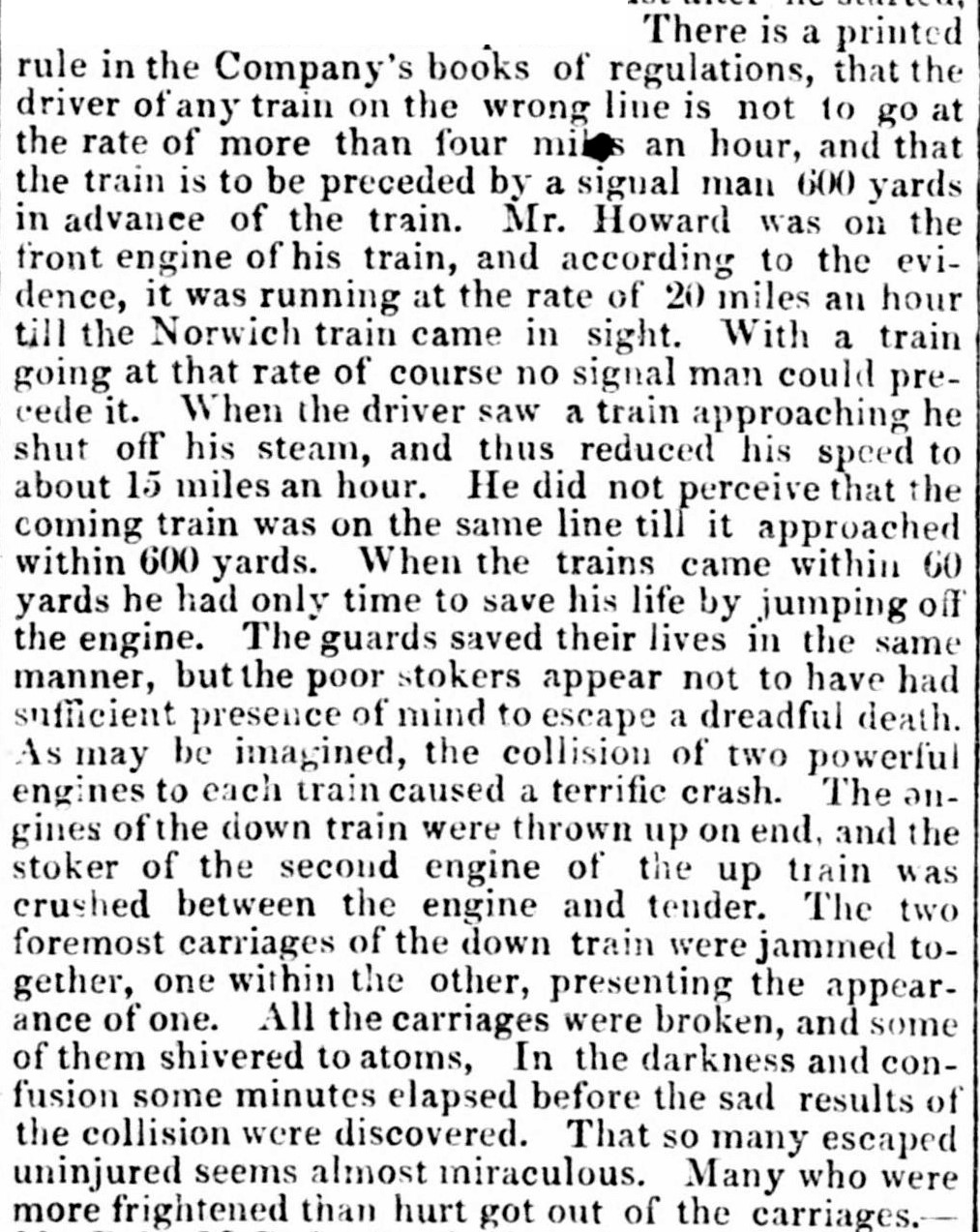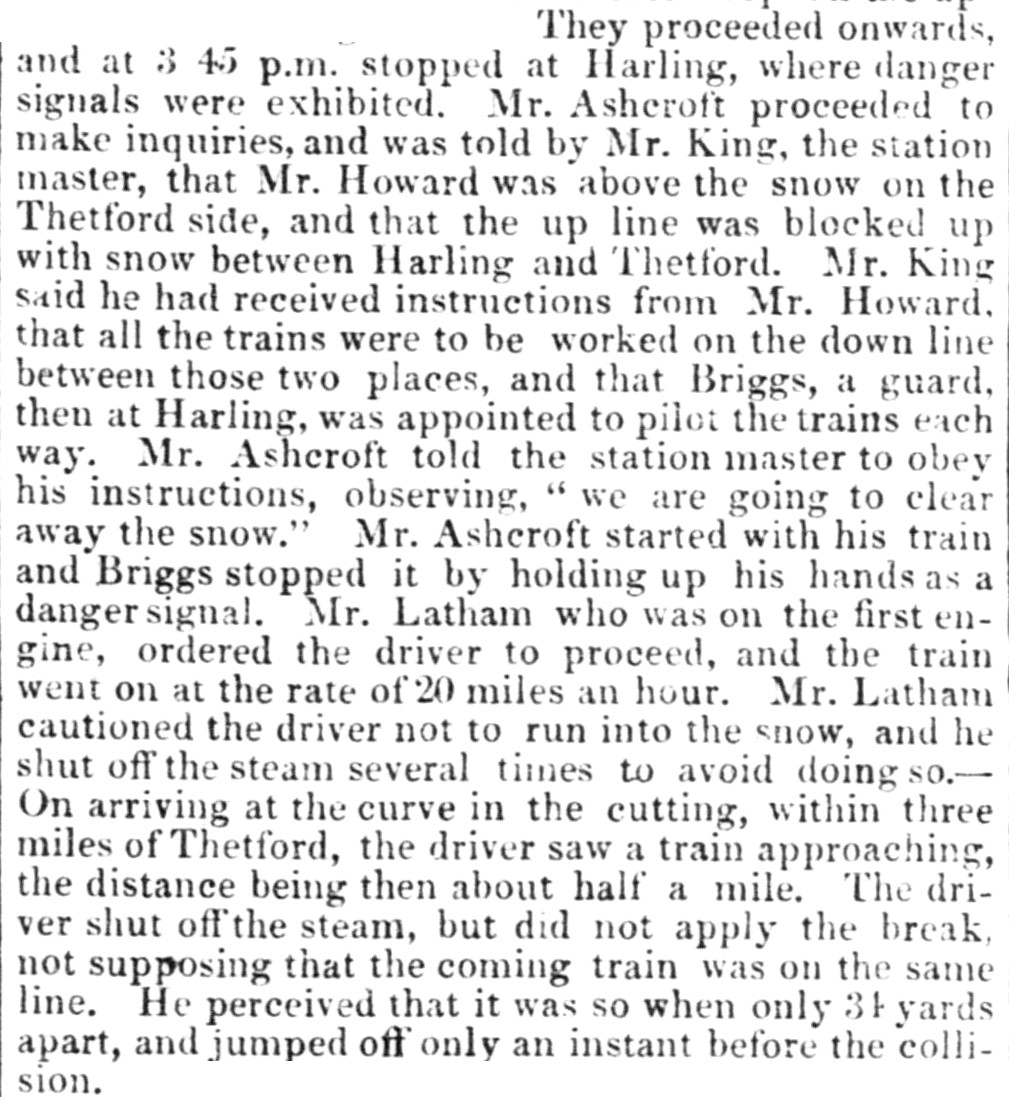 However, unbeknown to them or the driver of their train, the inspector of permanent way, Mr. Ashcroft, who was keen to clear the "down line", had taken a train with labourers towards Thetford from Harling against the advice of the signalman. Rounding a bend in the line the driver of Ashcroft's train saw a train coming towards him. He initially presumed that it was on the opposite line and by the time he realised that it wasn't it was too late! The driver and fireman of the Thetford train jumped clear just before the two engines collided at considerable speed. The details of what happened were reported in the inquest into the accident which was held only a few days later.
