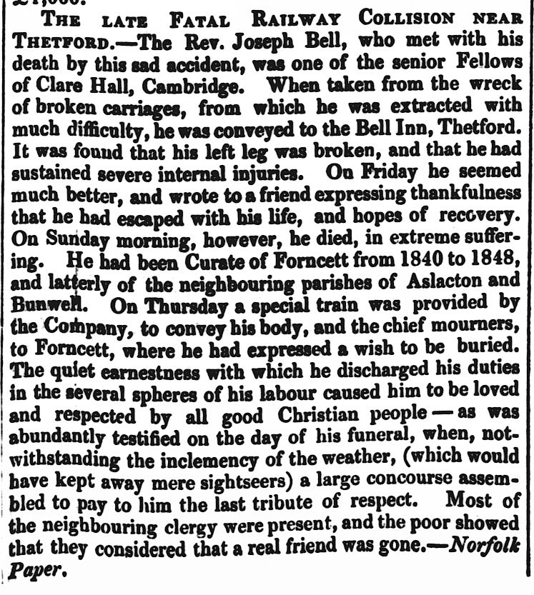 The roof of Bell's carriage was ripped off by the engine tender and all three occupants were severely crushed. With much difficulty, Joseph Bell was extracted from the wreckage and taken back to the Bell Inn in Thetford, where he was found to have sustained a broken left leg and internal injuries. He died on the following Sunday morning, 8th January 1854. He was just 38 years old.
