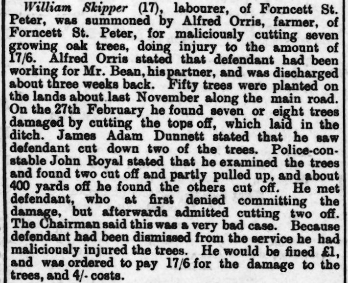 The job of the rural police constable must have been somewhat routine. In a village the size of Forncett the P.C. could know pretty well everyone, and a trawl of contemporary newspaper articles reveals that Forncett's crime scene involved such things as petty theft, poaching, vandalism, drunkenness, drinking after hours, illegal gambling and dealing with escaped cattle!